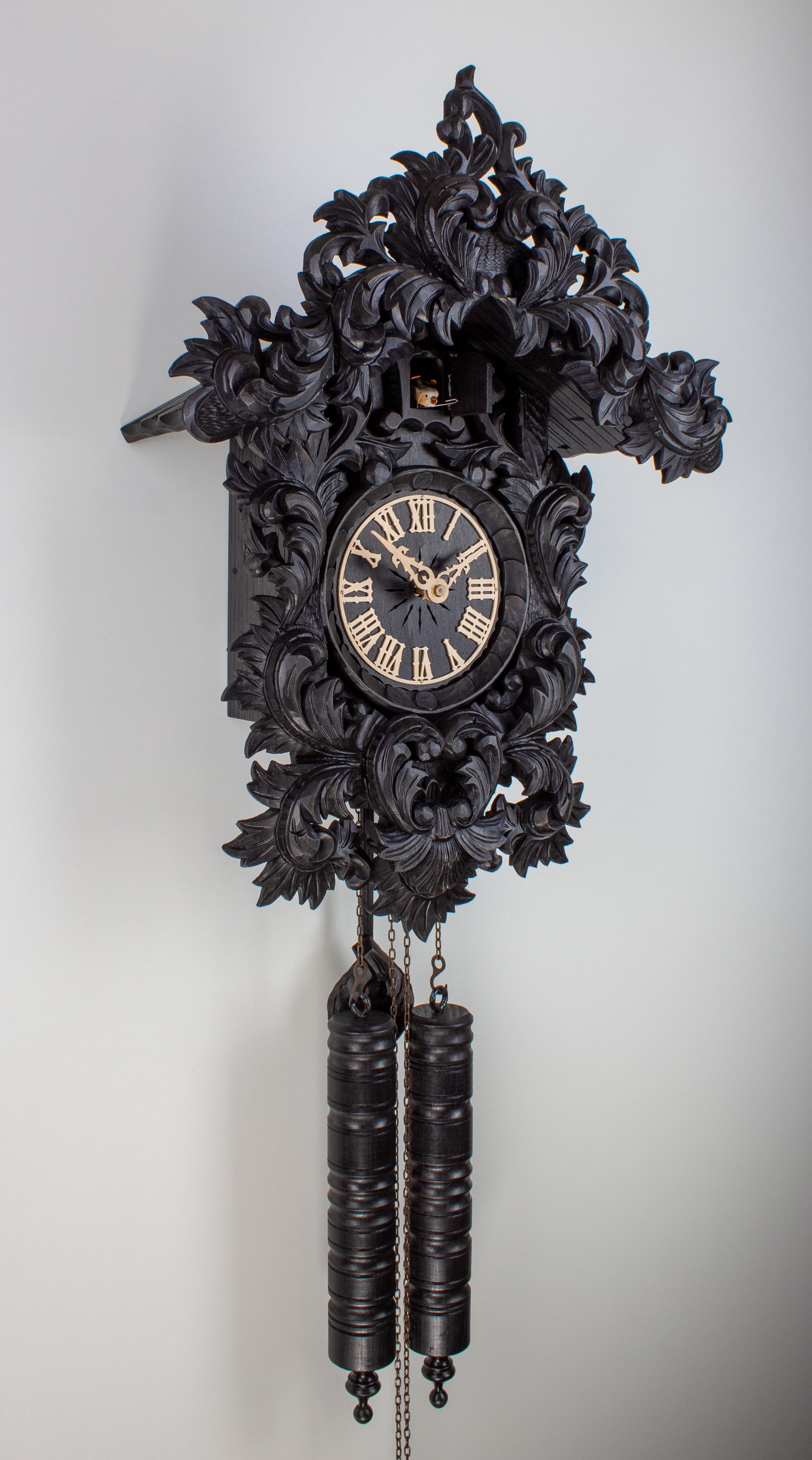 Der aus Holz gefertigte Kuckuck ruft zur vollen Stunde die Stundenzahl und zur halben Stunde einmal, dabei bewegt er seine Flügel.