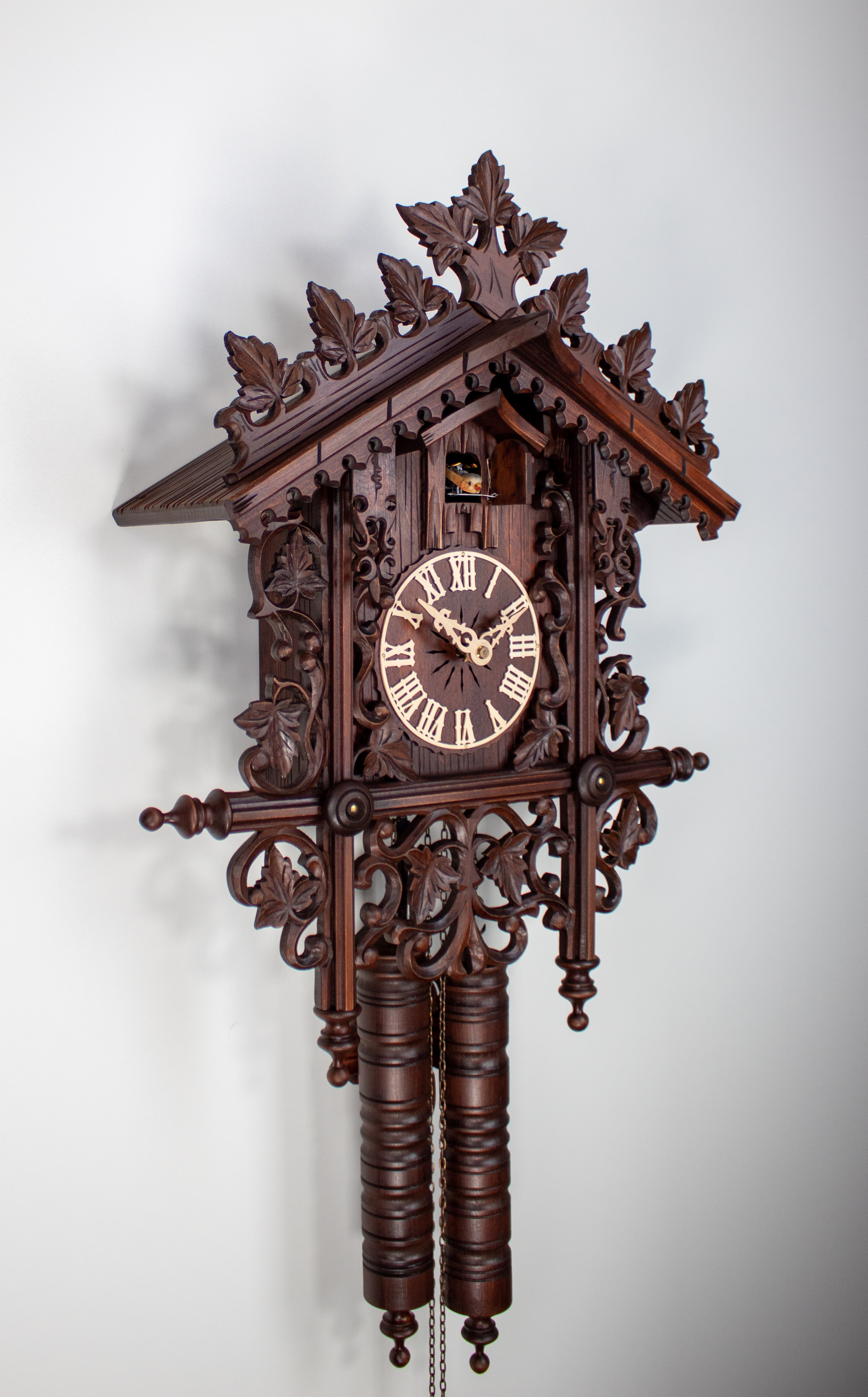 Der aus Holz gefertigte Kuckuck ruft zur vollen Stunde die Stundenzahl und zur halben Stunde einmal, dabei bewegt er seine Flügel.