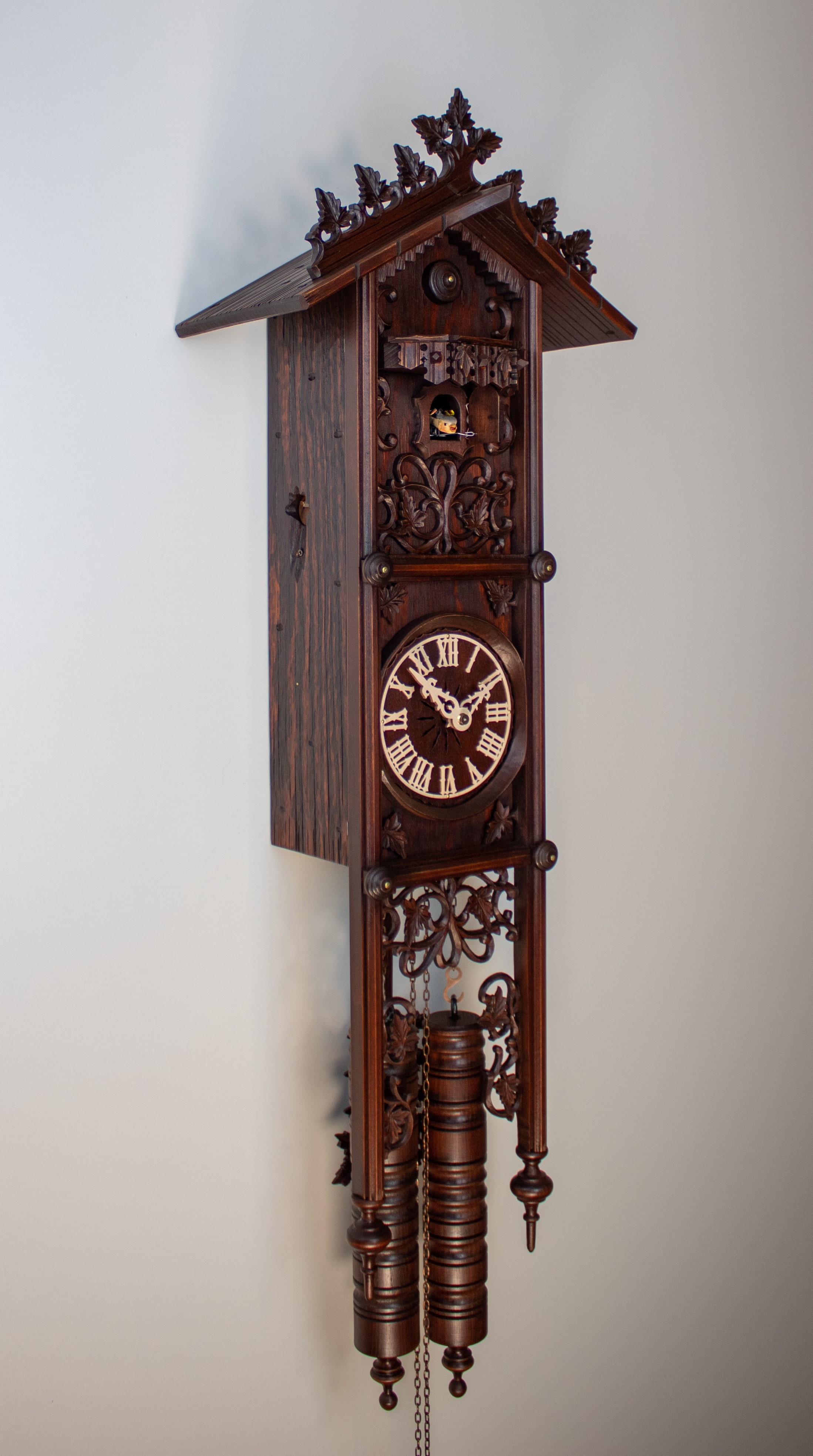 Der aus Holz gefertigte Kuckuck ruft zur vollen Stunde die Stundenzahl und zur halben Stunde einmal, dabei bewegt er seine Flügel.