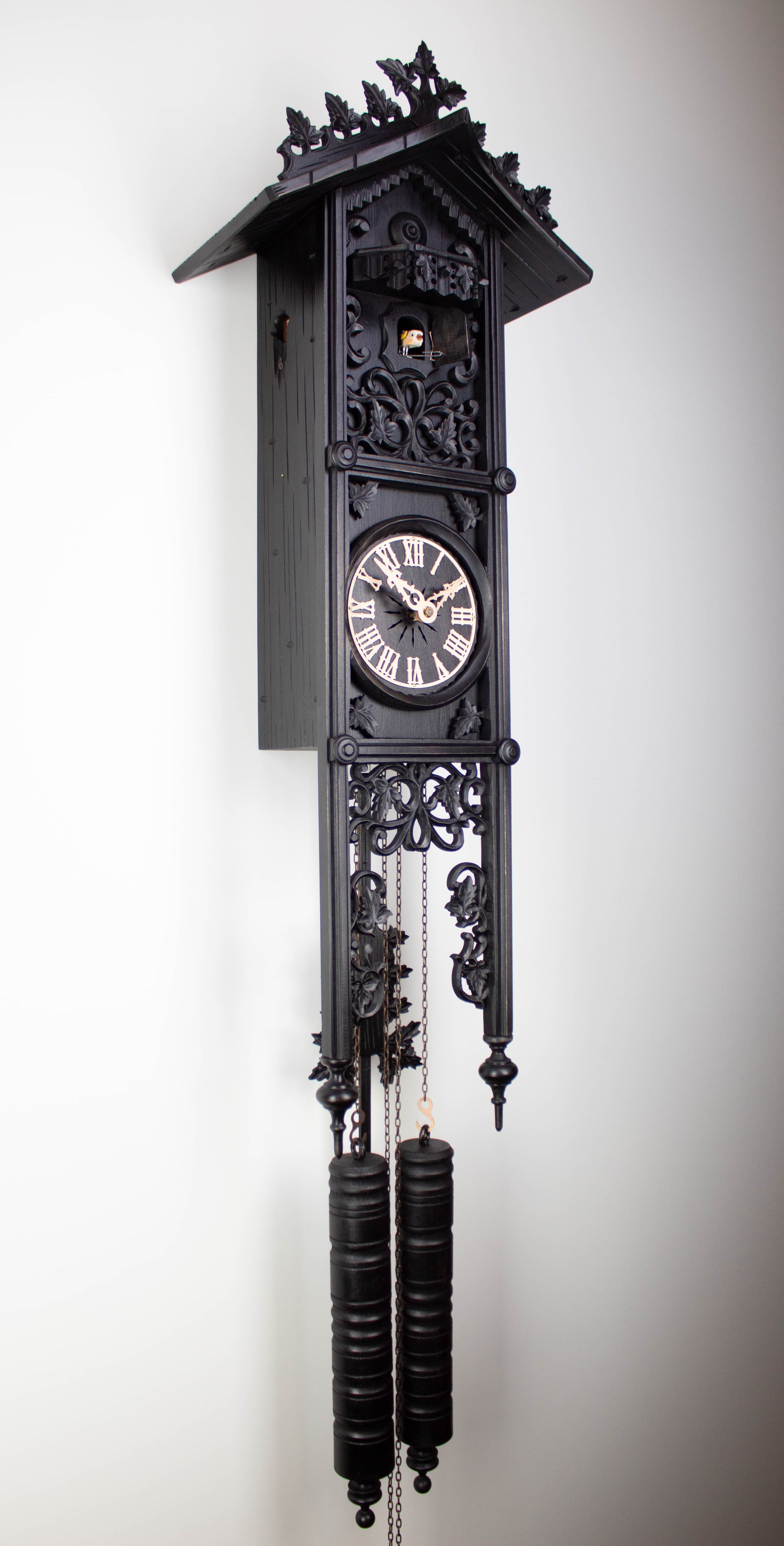 Der aus Holz gefertigte Kuckuck ruft zur vollen Stunde die Stundenzahl und zur halben Stunde einmal, dabei bewegt er seine Flügel.