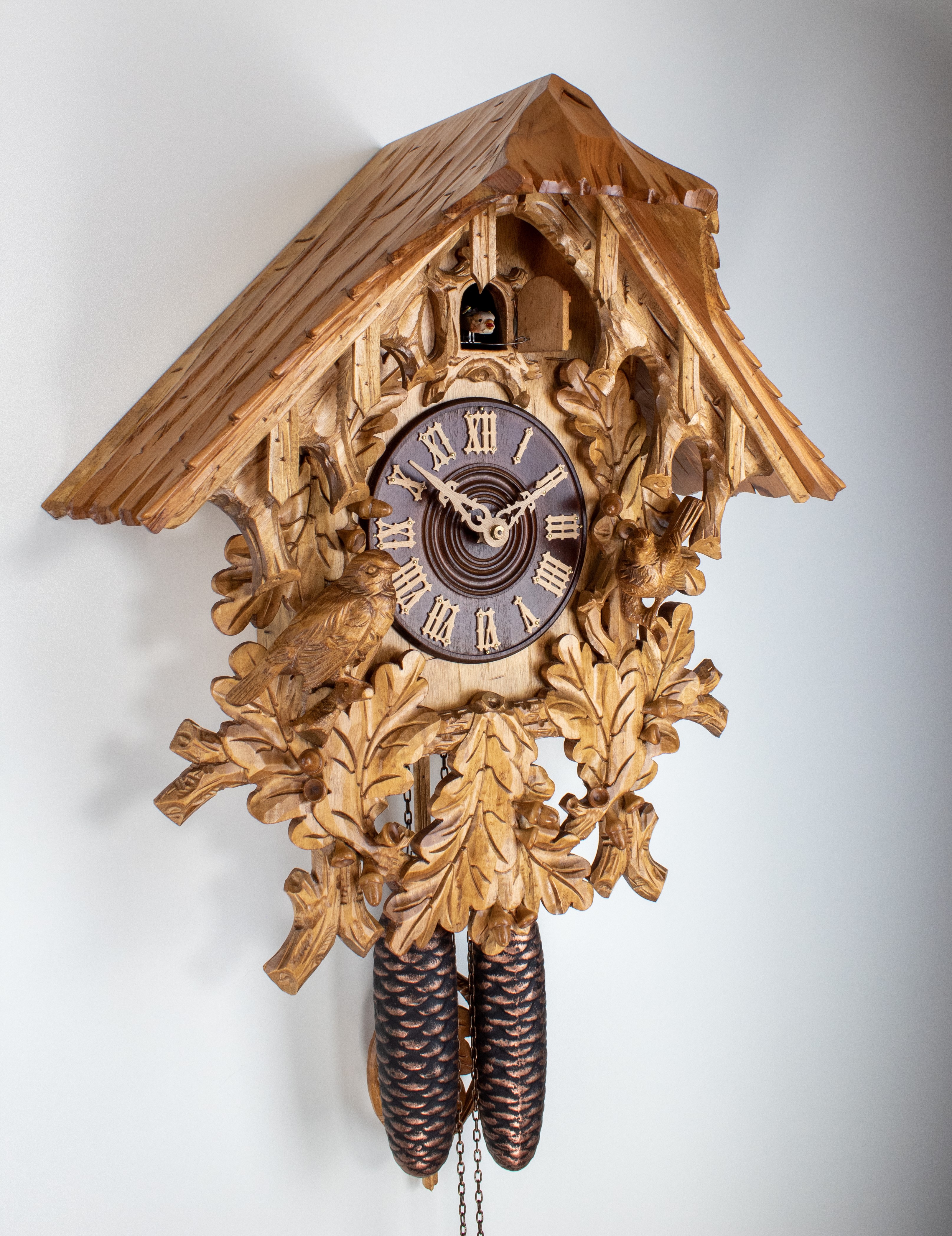 8 Tage Kuckucksuhr Schwarzwaldhaus mit Eichenlaub und Spatzen