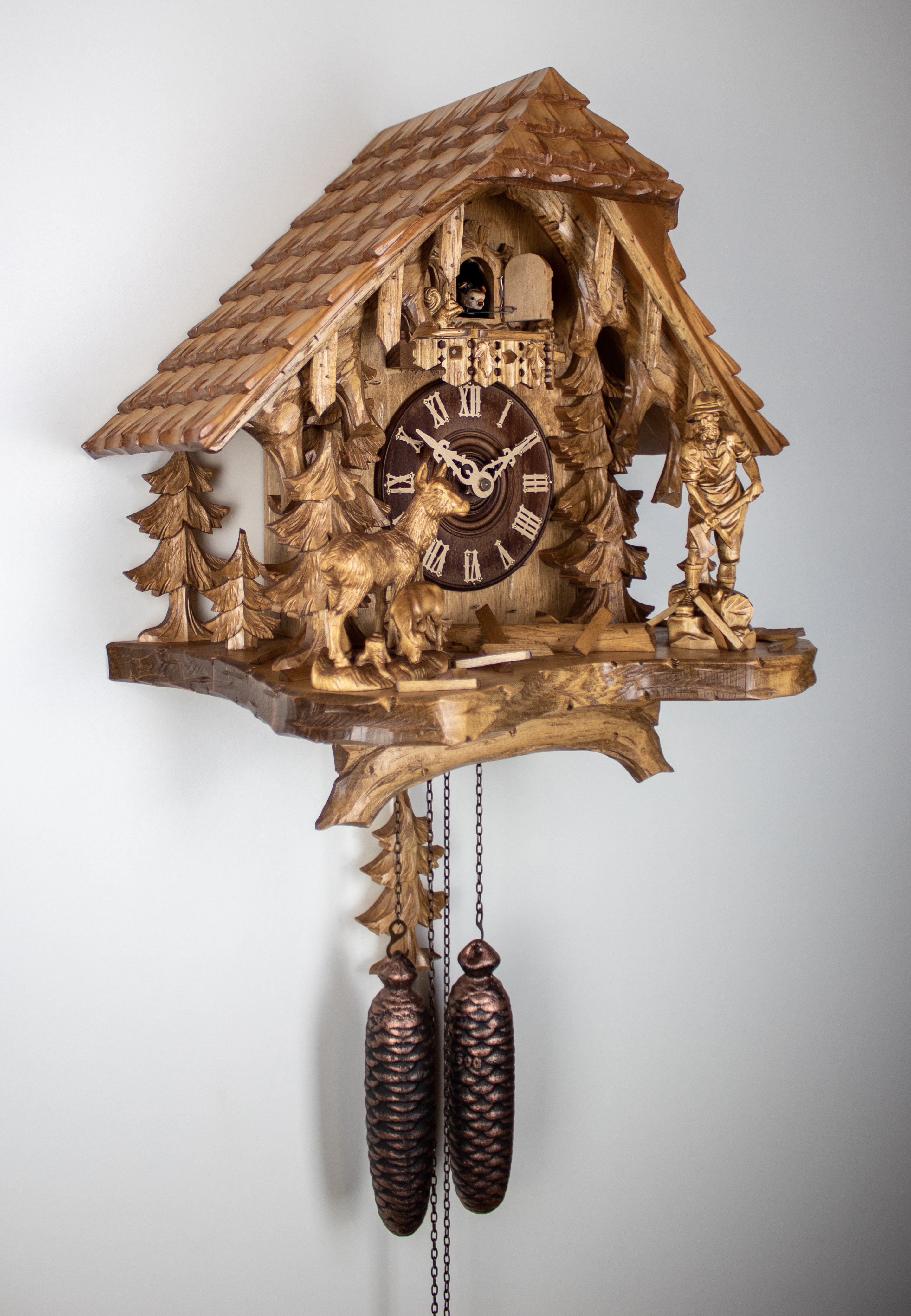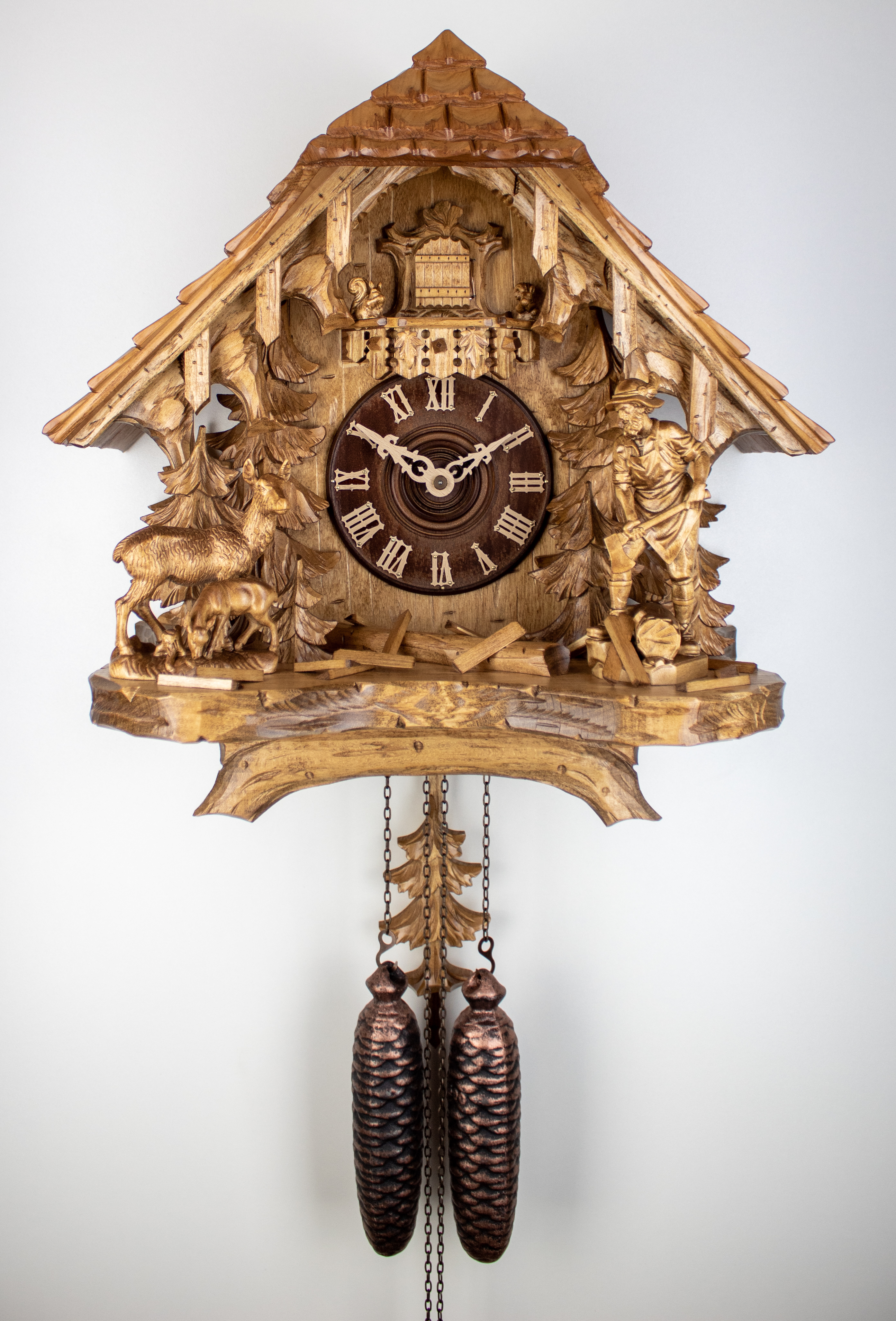 8 Tage Kuckucksuhr Schwarzwaldhaus mit Holzhacker und Rehfamilie