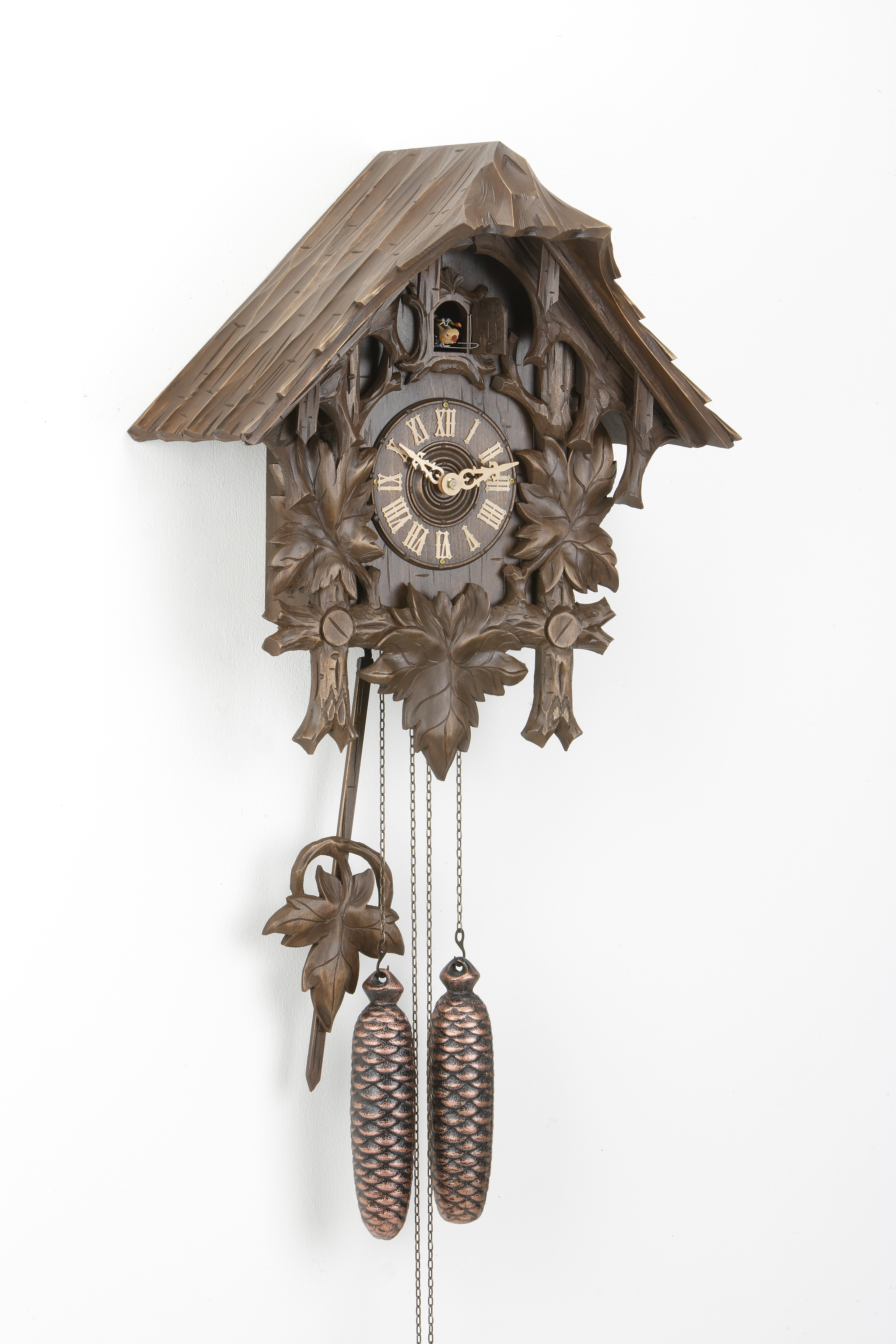 Der aus Holz gefertigte Kuckuck ruft zur vollen Stunde die Stundenzahl und zur halben Stunde einmal, dabei bewegt er seine Flügel.